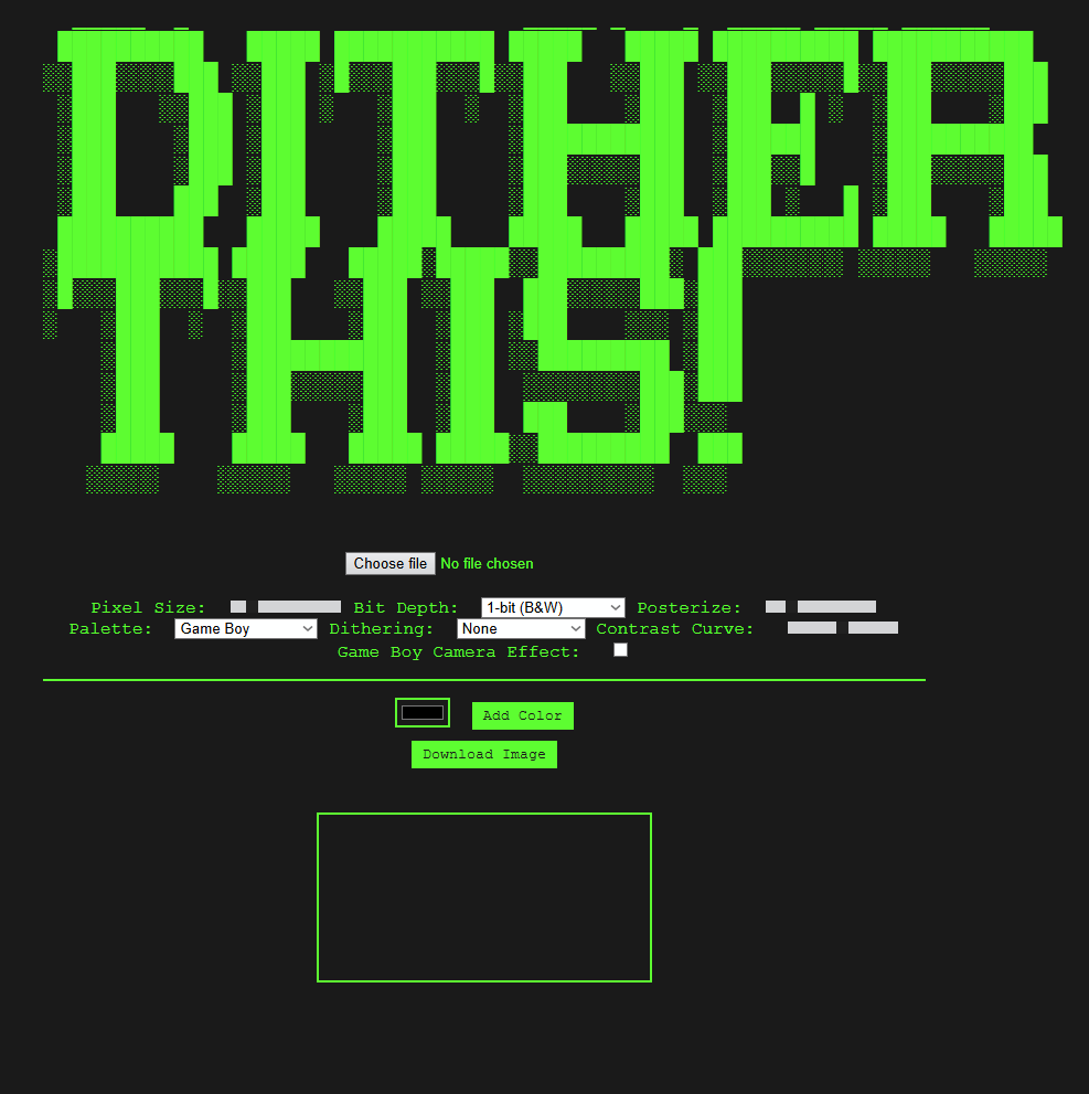 Pixels. Artifacts. Retro charm. DITHER THIS! is a browser-based image processing tool that deconstructs and reconstructs your images with a variety of dithering algorithms. Upload your image, choose from vintage palettes (Game Boy, C64, ZX Spectrum, etc.), tweak pixel size, contrast, and posterization, and let the algorithm tear it down and rebuild it in pure lo-fi glory. Whether you’re making pixel art, glitch aesthetics, or need authentic retro visuals, this tool gets it done.